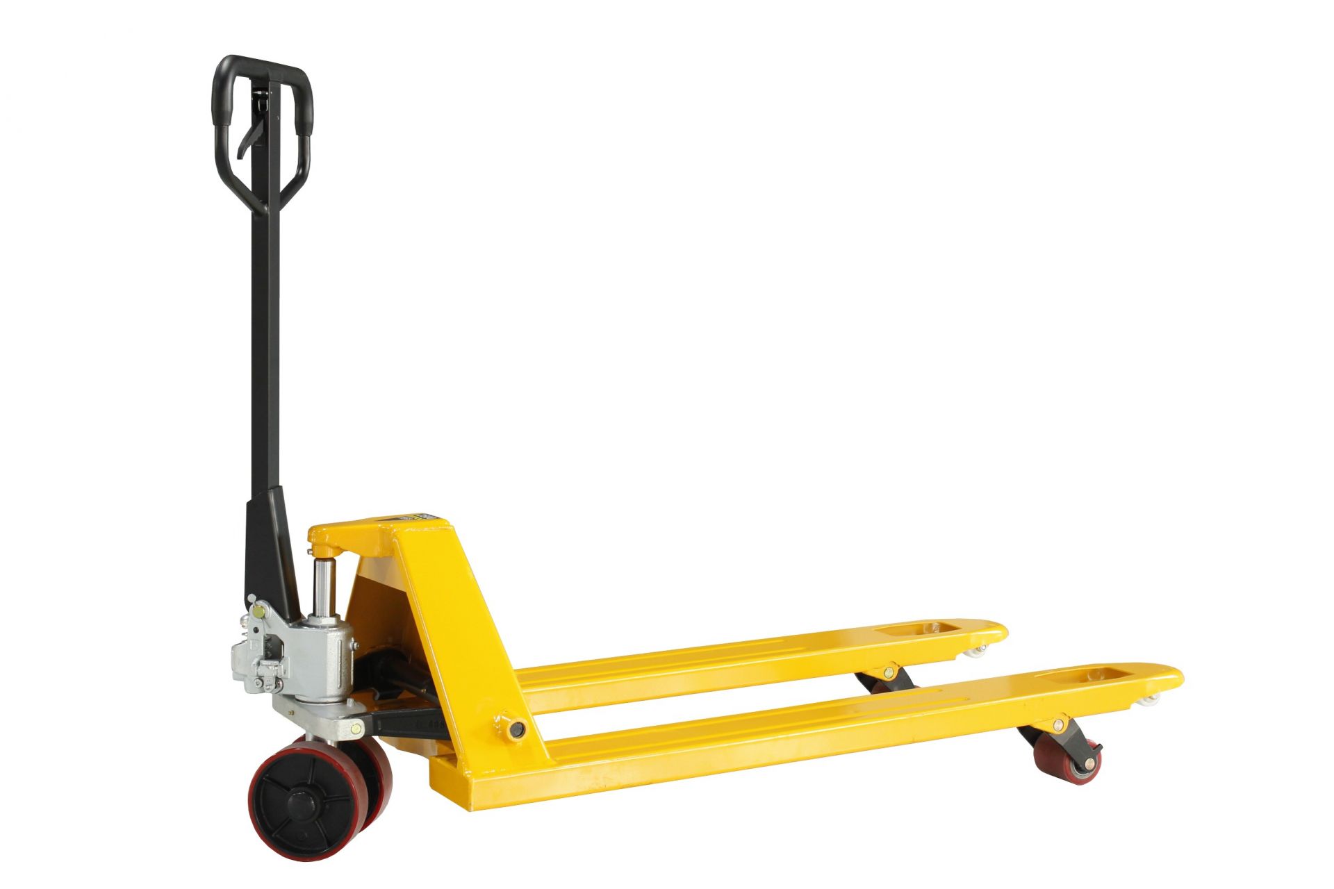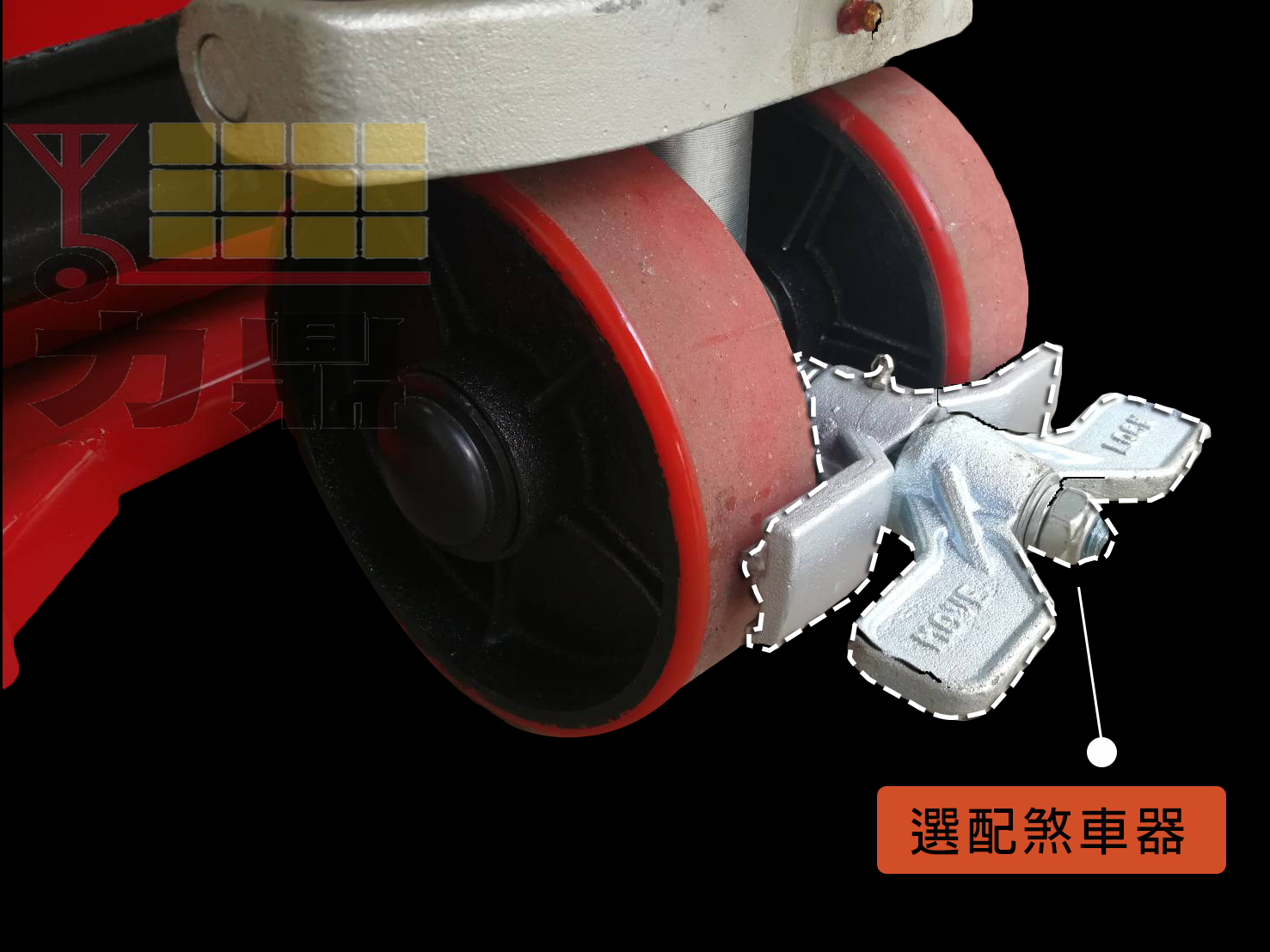 ■油壓拖板車前牙叉配有單輪及雙輪可供選擇,若遇見低棧板時,可選用低床式(65mm)之油壓拖板車。