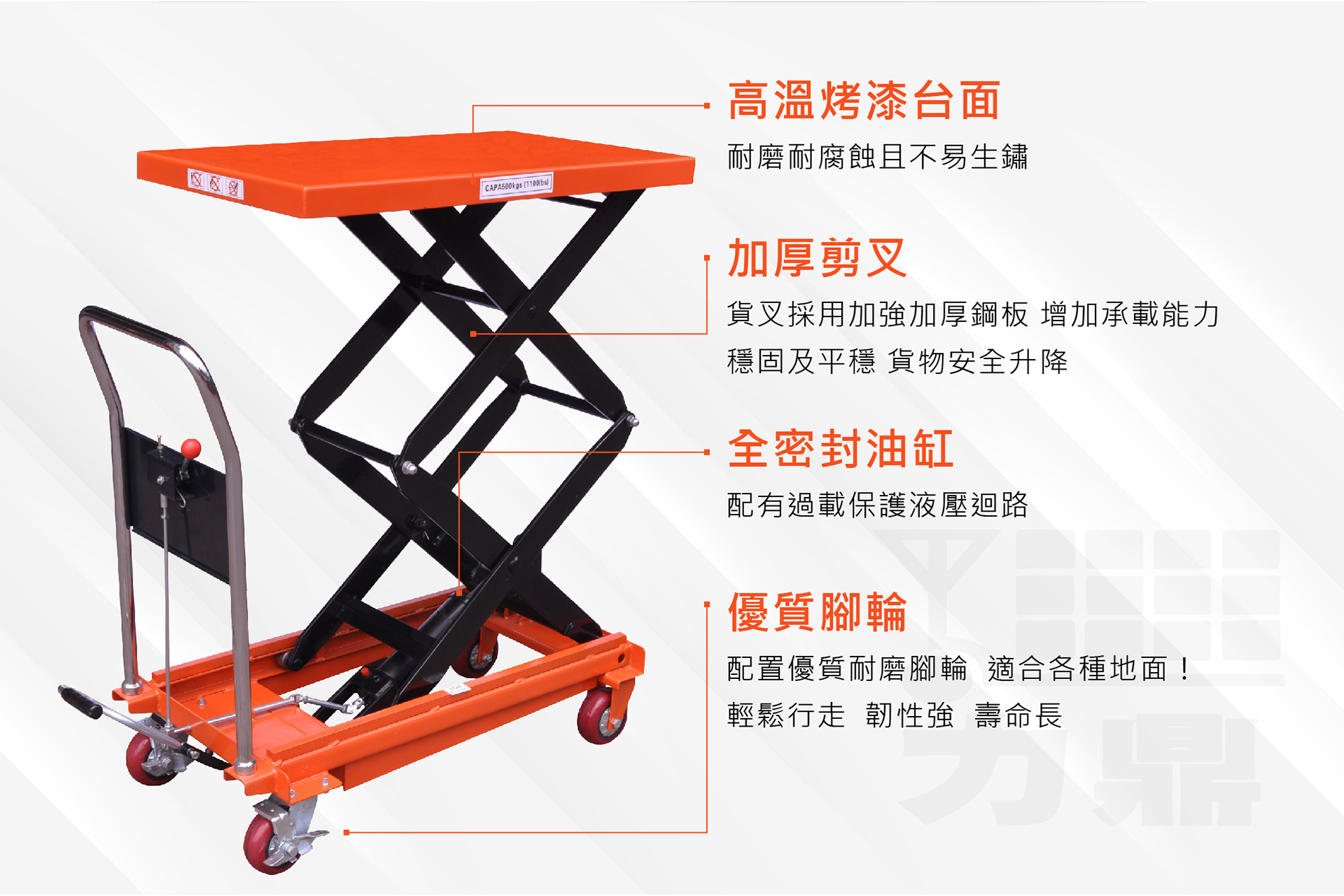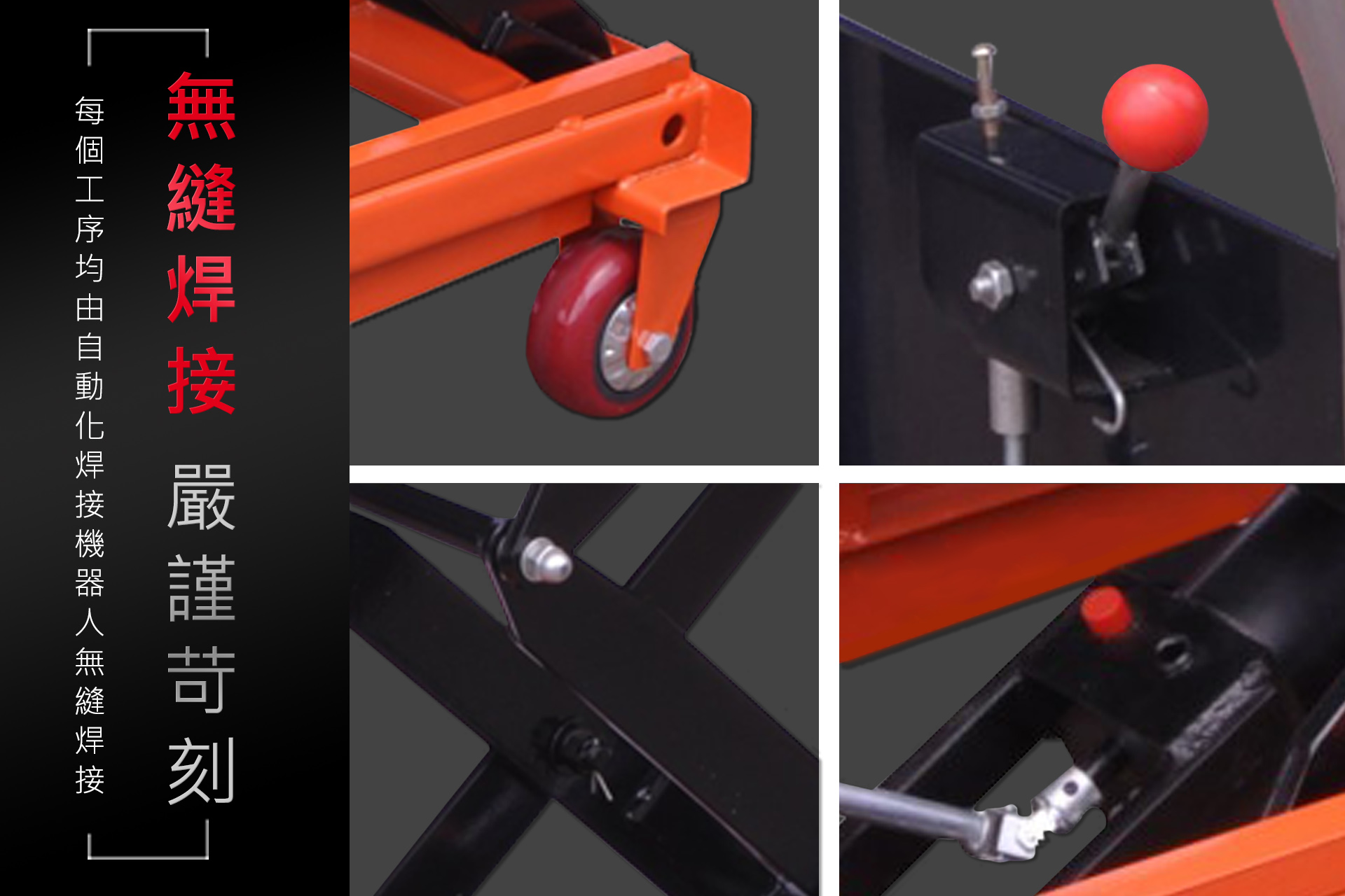 2.電動拖板車高質量PU導向輪可節省操作人員的力量,並且幫助升降台車省力移動。
